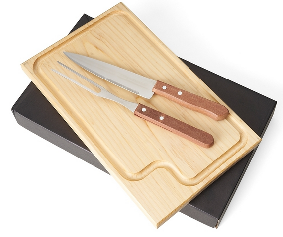 Descrição: Kit churrasco três peças em estojo de papel kraft, contém: faca, garfo e tábua de corte com canaleta.