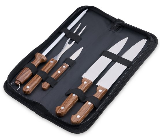 Descrição: O kit perfeito para os verdadeiros amantes de churrasco! Composto por 5 peças em inox com cabos plásticos simulando madeira, nosso kit inclui três facas, sendo de 7”, 6” e 3” polegadas, além de um garfo e uma chaira, todos acomodados em um prático estojo de nylon, ideal para transportar facilmente para qualquer lugar.