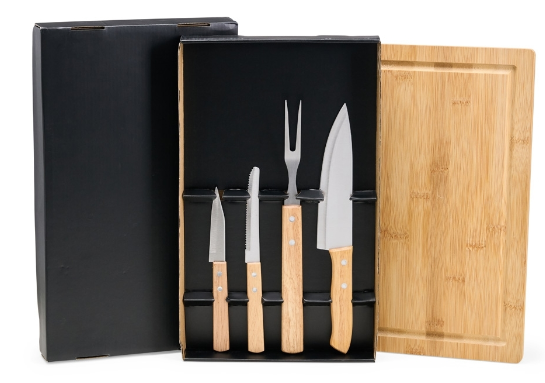 Descrição: Kit para preparar os churrascos mais deliciosos, composto por cinco peças com lâminas em aço inox e cabos de madeira. Inclui três facas de 3", 4" e 6" polegadas, um garfo e uma tábua de bambu, todos acomodados em uma caixa de papelão. É a escolha perfeita para quem aprecia uma boa carne em momentos de celebração.