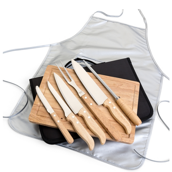 Descrição: Kit churrasco 8 peças com cabo em bambu, lâminas em aço inox e avental de nylon. Acompanha tábua em bambu com canaleta, 3 facas de corte e uma faca de serra cabo, chaira, garfo e avental prata com bolso. Acomodados em uma maleta de nylon preta. Rebites em Aço Inox, um dos mais resistentes à ferrugem e corrosão.