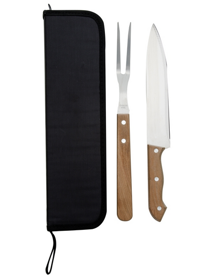 Descrição: Kit churrasco 2 peças com estojo, contém faca e garfo. Estojo com alça para transporte e área interna com elástico de fixação para os utensílios.