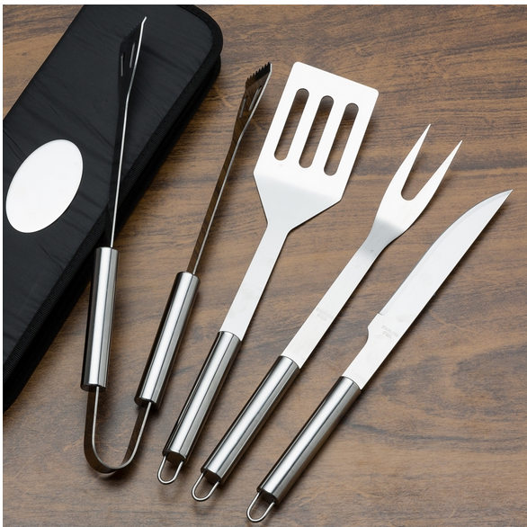 Descrição: Kit churrasco 4 peças em estojo de nylon com alça. Possui: pegador, garfo, espátula e faca em inox, acompanha proteções plásticas e parte interna com velcro para guardar as peças.